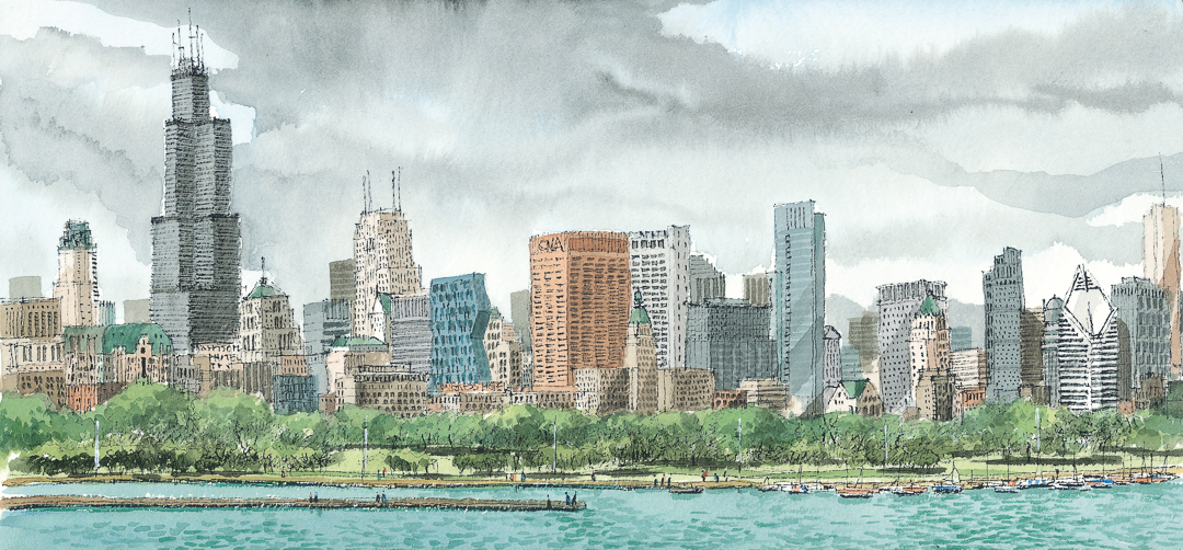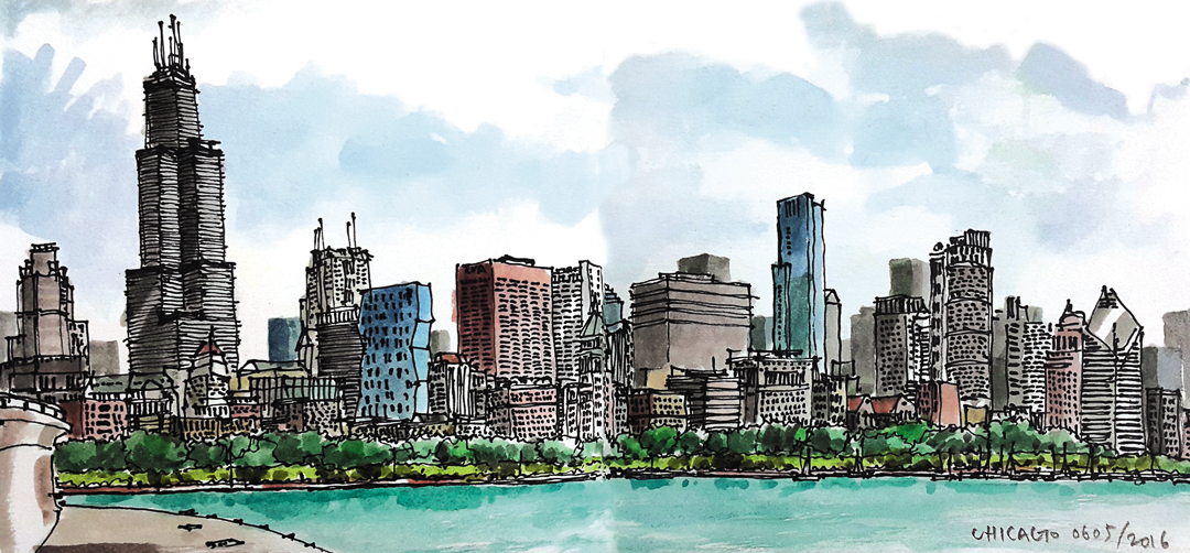 몇 년 전 시카고에서 돌아오는 기내에서 지루한 비행시간에 스케치북을 꺼내어 시카고 풍경을 떠올리며 그리고 있었다. 지나가던 매력적인 여승무원이 묻는다.