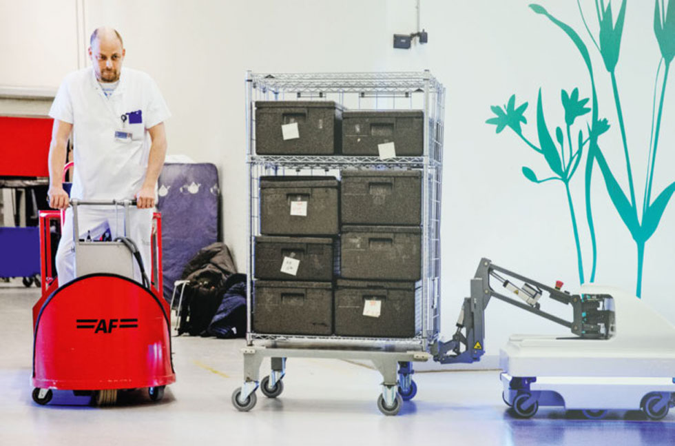 모바일 인더스트리얼 로봇(Mobile Industrial Robots) 사에서 개발한 MiR100 로봇은 쓰레기통, 트롤리, 스쿠터, 침상을 밀고 있는 의료진들, 여러 무리의 병원 직원들과 기타 물류 로봇 사이를 지나다니며 각 병동의 환자들에게 식사를 전달한다. 이 로봇은 하루 4회 식사를 전달하고 다시 병원 내 주방으로 접시를 반납하는 업무를 담당하고 있다.
